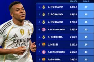 而在歐冠單賽季進球排行榜上,姆巴佩距離C羅在2013/14賽季的17球紀(jì)錄還有6球之差。