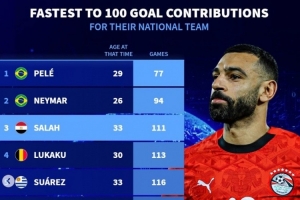 國家隊最快直接參與100球榜:薩拉赫第3,梅西第6、C羅第9