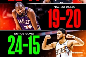 太陽本賽季前39場,戰(zhàn)績24勝15負(fù),暫時排名西部第6。上賽季同期,他們戰(zhàn)績是19勝20負(fù)。