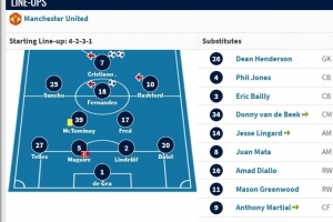 替補席則是:迪恩·亨德森、菲爾·瓊斯、拜利、范德貝克、林加德、馬塔、阿瑪?shù)?、格林伍德、馬夏爾。