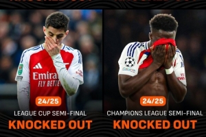 阿森納近4次參加半決賽皆出局,創(chuàng)造隊(duì)史半決賽連續(xù)出局紀(jì)錄