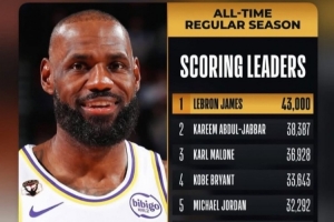 在本場比賽中,詹姆斯常規(guī)賽生涯總得分突破43000里程碑,賽后他轉發(fā)了個人海報,并寫道:“繼續(xù)前進??。”
