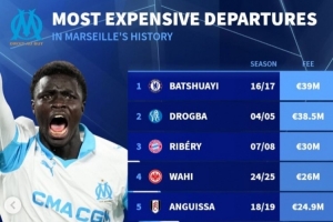 體育資訊1月15日訊 羅馬已經(jīng)官宣引進(jìn)馬賽18歲中鋒瓦斯,《轉(zhuǎn)會(huì)市場(chǎng)》也統(tǒng)計(jì)了馬賽隊(duì)史最貴轉(zhuǎn)出情況,巴舒亞伊居首。