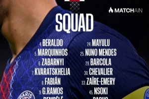 巴黎對(duì)陣?yán)餇柮麊危旱秦惾R、杜埃、K77在列,若昂·內(nèi)維斯缺席