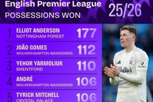 體育資訊1月10日訊 數(shù)據(jù)機(jī)構(gòu)squawka統(tǒng)計(jì)了本賽季英超贏得球權(quán)情況,諾丁漢森林中場埃利奧特·安德森獨(dú)自領(lǐng)跑。
