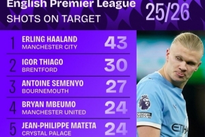 本賽季英超射正榜:哈蘭德居首,塞梅尼奧、薩卡+曼聯(lián)三叉戟在列