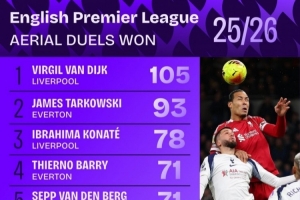 體育資訊1月10日訊 Squawka統(tǒng)計(jì)了本賽季球員在英超成功爭(zhēng)頂?shù)拇螖?shù),并列出榜單,范戴克105次居首,而且他77.2%的爭(zhēng)頂成功率也是英超最高(至少嘗試25次)。