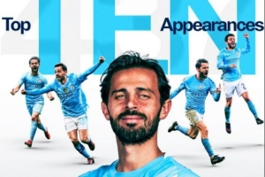 據(jù)統(tǒng)計,這是B席第437次代表曼城出場,躋身隊史出場次數(shù)前十,具體榜單如下: