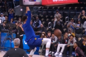 賽前熱身,庫(kù)里在一位孩子的配合下,完成了空接暴扣,這一幕也驚呆了場(chǎng)邊的“小學(xué)生”。