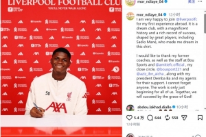 體育資訊1月10日訊 塞內(nèi)加爾18歲中衛(wèi)恩迪亞耶更新社媒動態(tài),曬出與利物浦簽約的照片,