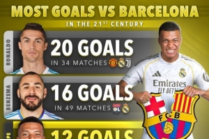 體育資訊1月10日訊 北京時間1月12日凌晨,皇馬將在西超杯決賽中對陣巴薩。Score90統(tǒng)計了本世紀球員對陣巴薩的進球數(shù)量,C羅、本澤馬、姆巴佩排名前三。