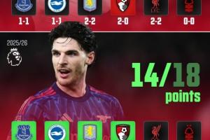 據(jù)AFTV統(tǒng)計,阿森納近六輪英超拿到了18個積分中的14分,相比上賽季相同的六場比賽,多拿了9個積分。