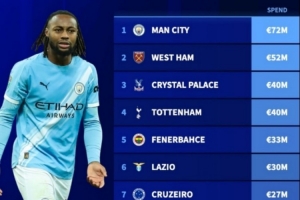 德轉(zhuǎn)列冬窗目前花費(fèi)榜:曼城7200萬歐居首,前四均為英超球隊(duì)