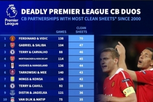 體育資訊1月20日訊 德國轉(zhuǎn)會市場統(tǒng)計(jì)了2000年以來英超中衛(wèi)組合的零封次數(shù),費(fèi)迪南德、維迪奇70場零封居首,加布里埃爾、薩利巴47場零封次席。